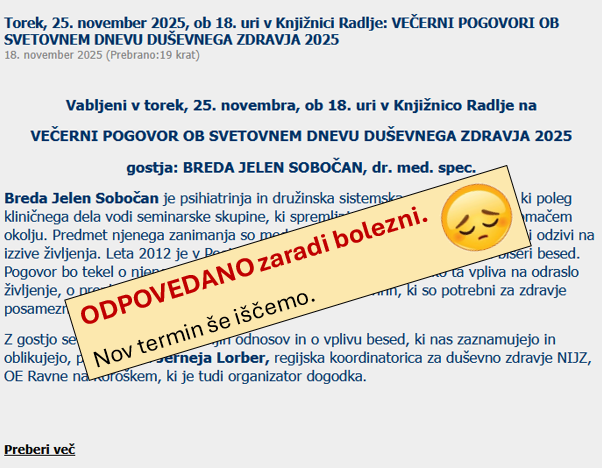 BRALNO SREČANJE v Knjižnici Radlje, v četrtek, 20. novembra, ob 9. uri. Z bibliotekarko Aleksandro se bodo udeleženci pogovarjali na temo: Naša mladost. Knjige, ki smo jih brali in živeli. Vabljeni vsi, ki radi berete in se o prebranem pogovarjate.